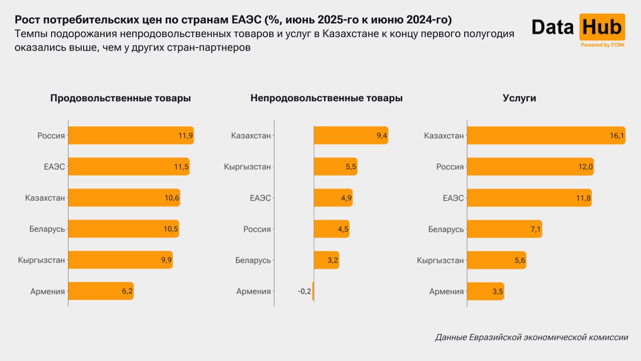 Отмечается, что темпы подорожания непродовольственных товаров в целом оказались в РК самыми высокими. То же можно сказать и об услугах, а вот с продовольствием, напротив, казахстанские результаты чуть лучше среднего по ЕАЭС.