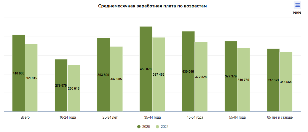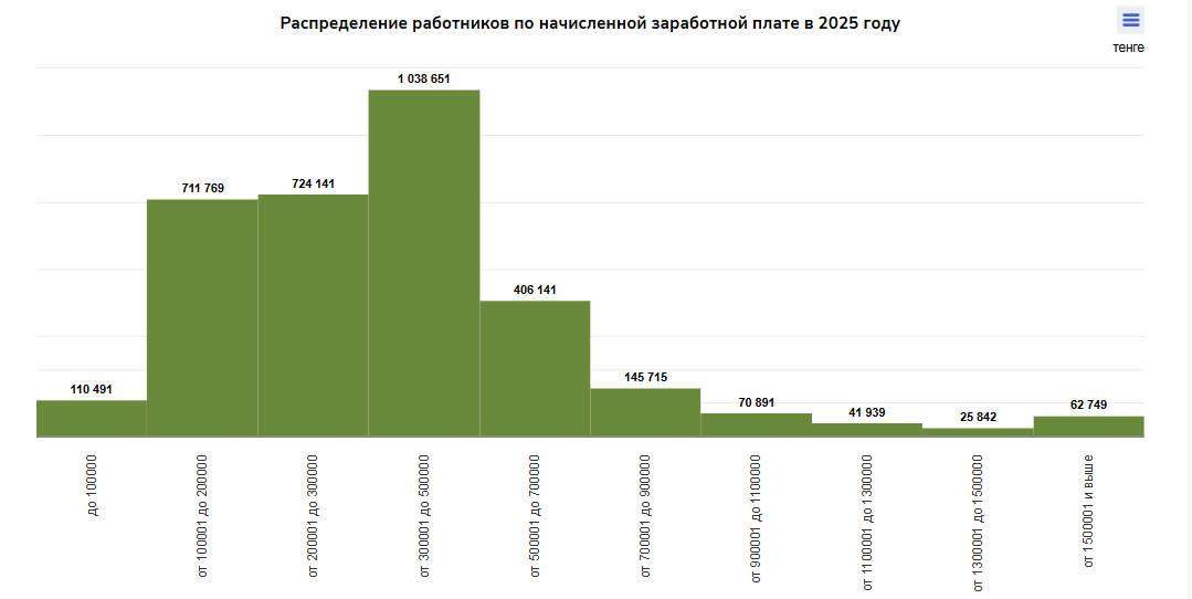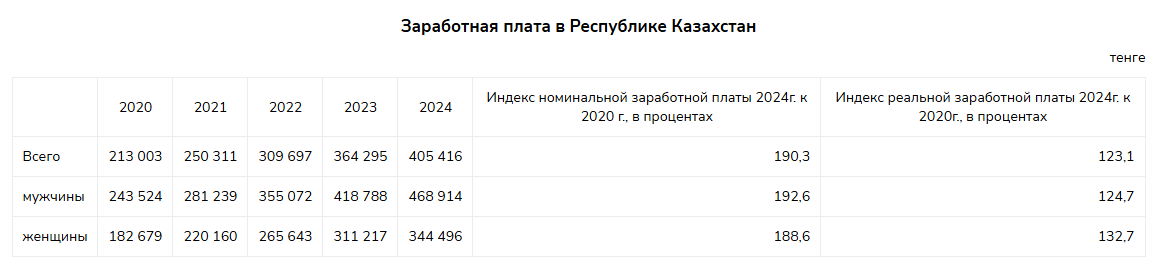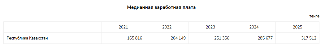 Медианная заработная плата в Республике Казахстан в 2025 году составила 317512 тенге и выросла по сравнению с 2024 годом на 11,1%, в реальном выражении – на 0,4%.