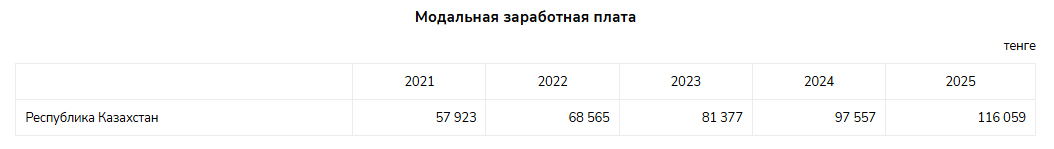 Модальная заработная плата в 2025 году составила 116059 тенге и выросла по сравнению с 2024 годом на 19,0%, в реальном выражении – на 7,5%.