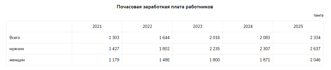 Почасовая заработная плата одного работника в 2025 году составила в среднем 2334 тенге и выросла с 2024 года на 12,0%.
