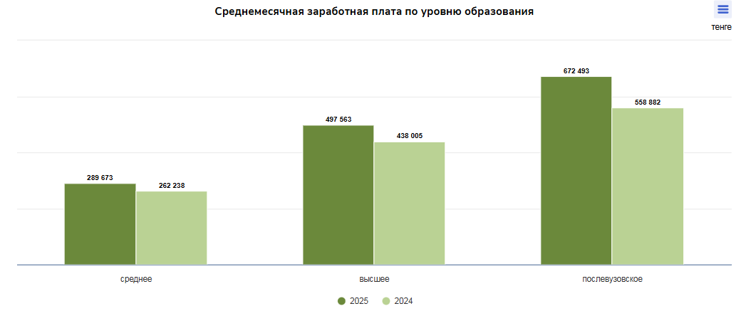 По сравнению с 2024 годом наибольший рост среди работников с послевузовским образованием составил 20,3%, наименьший – со средним образованием 10,0%.