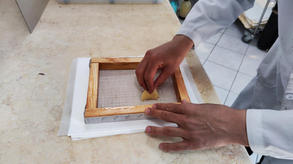 Ручное литьё бумаги осуществляется с применением технологии переработки бумажных обрезков и непригодных материалов, оставшихся после реставрации. Кроме того, специалисты Центра провели эксперимент с бумажной массой, привезённой из-за рубежа.