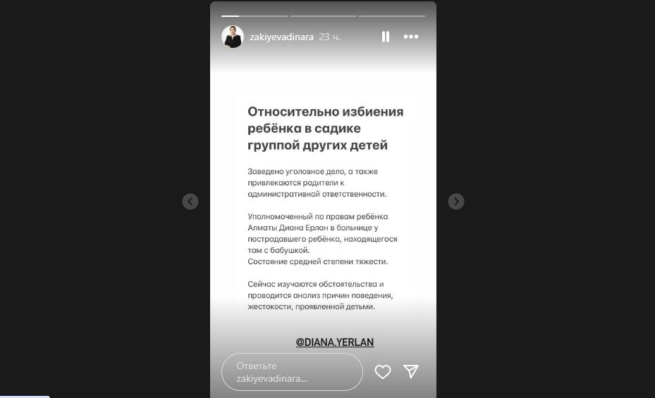 Уполномоченный по правам ребёнка Алматы Диана Ерлан в больнице у пострадавшего ребёнка, находящегося там с бабушкой. Состояние — средней степени тяжести. Сейчас изучаются обстоятельства и проводится анализ причин поведения, жестокости, проявленной детьми", — сообщила Закиева в Instagram-Stories.